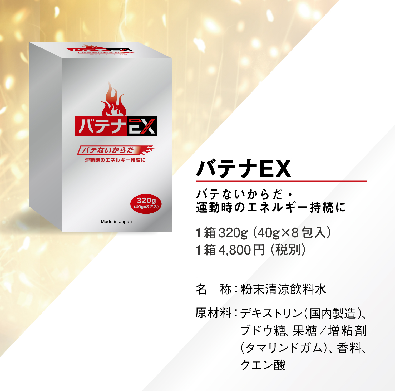 バテナEXを運動前及び運動時に使用すると、即効性のエネルギーが供給され、パフォーマンスの向上が期待できます。